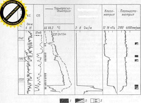 Рис. 181. Определение интервалов поступления воды и нефти в скважину по комплексу геофизических методов (Южный Мангышлак, месторождение Узень, скв. 1523). / — нефть; 2— вода с нефтью; 3 — интервал перфорации