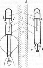 Диэлектрическая проницаемость флюидов измеряется скважинными приборами - диэлектрическими влагомерами. Диэлектрический влагомер представляет собой измерительный КС-генератор, в колебательный контур которого включен измерительный проточный конденсатор. Между обкладками конденсатора протекает водонефтяная или водогазовая смесь. Существуют пакерные и беспакерные влагомеры (рис. 182, а, б). Для измерения диэлектрической проницаемости флюидов используется скважинный расходомер-влагомер «Кобра-ЗбРВ», имеющий пакер, диаметр которого в раскрытом состоянии 155 мм, и позволяющий устанавливать содержание воды в нефти от 0 до 60 %.