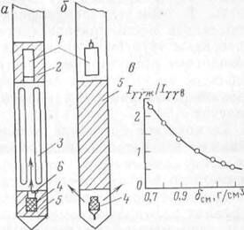 Разработаны два способа определения плотности жидкости: по изменению интенсивности гамма-излучения после прохождения гамма-квантов через слой жидкости, находящейся между источником и детектором гамма-излучения,— ГГП-П и по рассеянию гамма-квантов окружающей прибор жидкостью -ГГП-Р. Модификация ГГП-П позволяет изучать плотность смеси между источником и детектором (рис. 183, а), а с помощью ГГП-Р получают среднюю плотность смеси по всему сечению колонны (рис. 183, б).