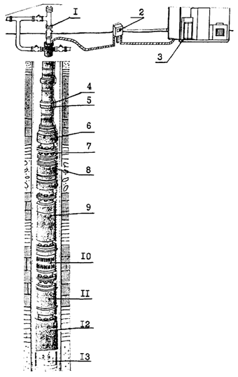 1 — оборудование устья скважин; 2 — пункт подключательный выносной; 3 — трансформаторная комплексная подстанция; 4 — клапан спускной; 5 — клапан обратный; 6 — модуль-головка; 7 — кабель; 8 — модуль-секция; 9 — модуль насосный газосепараторный; 10 — модуль исходный; 11 — протектор; 12 — электродвигатель; 13 — система термоманометрическая.
