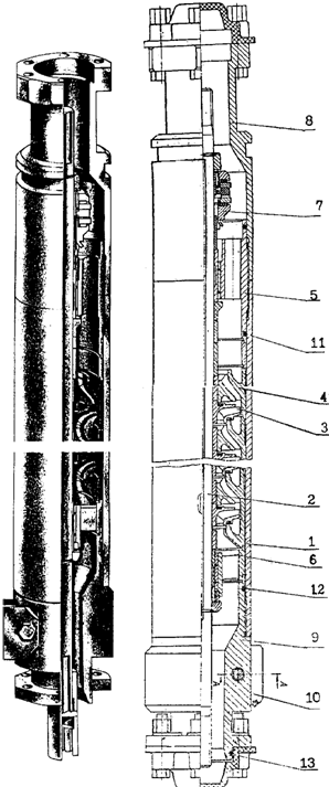 Модуль-секция насоса (рисунок 25) состоит из корпуса 1, вала 2, пакетов ступеней (рабочих колес — 3 и направляющих аппаратов — 4), верхнего подшипника 5, нижнего подшипника 6, верхней осевой опоры 7, головки 8, основания 9, двух ребер 10 (служат для защиты кабеля от механических повреждений) и резиновых колец 11, 12, 13.