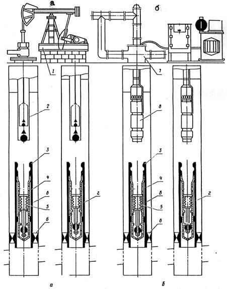а — для скважин, эксплуатируемых скважинными штанговыми насосами; б — для скважин, эксплуатируемых центробежными электронасосами; в — клапан‑отсекатель открыт; г — клапан‑отсекатель закрыт; 1 — станок‑качалка; 2 — скважинный штанговый насос; 3 — замок типа ЗНЦБ; 4 — разъединитель колонны типа ЗРК; 5 — клапан‑отсекатель типа КАС; 6 — пакер 2ПД‑ЯГ; 7 — оборудование устья скважины; 8 — центробежный скважинный электронасос.