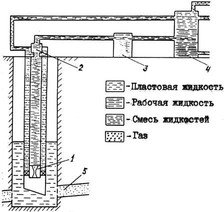 1 — струйный насос; 2 — ловитель; 3 — силовой насос; 4 — сепаратор; 5 — продуктивный пласт