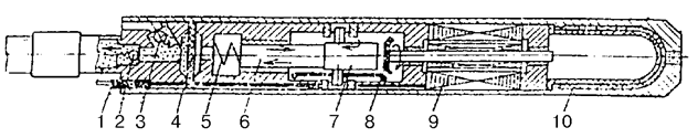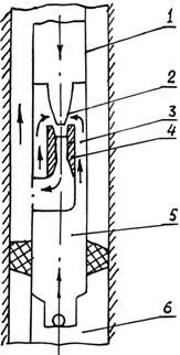 Струйный насос (рисунок 37) приводится в действие под влиянием напора рабочей жидкости (лучше нефти или воды), нагнетаемой в НКТ 1, соединенные с соплом 2. При прохождении узкого сечения сопла струя перед диффузором 4 приобретает большую скорость и поэтому в каналах 3 снижается давление. Эти каналы соединены через полость насоса 5 с подпакерным пространством 6 и пластом, откуда пластовая жидкость всасывается в насос и смешивается в камере смешения с рабочей. Смесь жидкостей далее движется по кольцевому пространству насоса и поднимается на поверхность по межтрубному пространству (насос спускают на двух концентрических рядах труб) под давлением нагнетаемой в НКТ рабочей жидкости. Насос может откачивать высоковязкие жидкости и эксплуатироваться в сложнейших условиях (высокие температуры пластовой жидкости, содержание значительного количества свободного газа и песка в продукции и т.д.).