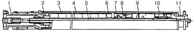 1 — головка; 2 — переводник; 3 — сепаратор; 4 — корпус; 5 — вал; 6 — решетка; 7 — направляющий аппарат; 8 — рабочее колесо; 9 — шнек; 10 — подшипник; 11 — основание.