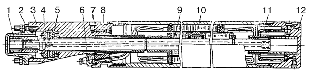 1 — соединительная муфта; 2 — крышка; 3 — головка; 4 — пятка; 5 — подпятник; 6 — крышка кабельного ввода; 7 — пробка; 8 — колодка кабельного ввода; 9 — ротор; 10 — статор; 11 — фильтр; 12 — основание.