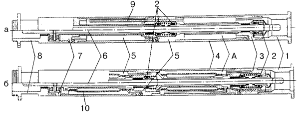А — верхняя камера; Б — нижняя камера; 1 — головка; 2 — торцевое уплотнение; 3 — верхний ниппель; 4 — корпус; 5 — средний ниппель; 6 — вал; 7 — нижний ниппель; 8 — основание; 9 — соединительная трубка; 10 — диафрагма.