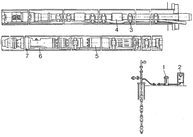 1 — трансформатор; 2 — комплектное устройство; 3 — пояс крепления кабелей; 4 — НКТ; 5 — винтовой насос; 6 — кабельный ввод; 7 — электродвигатель с гидрозащитой.