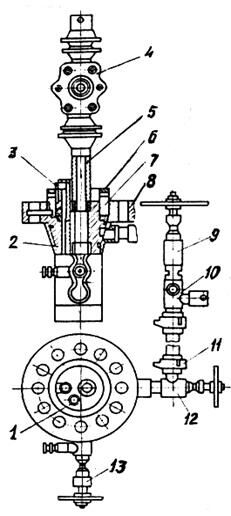 Для герметизации устья нефтяных скважин, эксплуатируемых погружными центробежными, винтовыми и диафрагменными электронасосами, применяют устьевую арматуру типа АУЭ-65/50-14 или устьевое оборудование типа ОУЭ‑65/50‑14. Арматура типа АУЭ-65/ 50-14 состоит из корпуса, трубной подвески, отборника давления с пробоотборником, угловых вентилей, перепускного клапана и быстросборного соединения (рисунок 32).