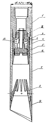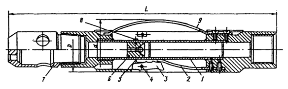 1 — переводник; 2 — упор; 3 — клапан; 4 — пружина; 5 — штифт; 6 — запорная втулка; 7 — корпус; 8 — овершот; 9 — направляющая.