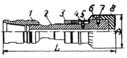 На утолщение в нижней части корпуса 2 надевается резиновый стакан 8, который прикреплен к корпусу четырьмя винтами 7. На резиновый стакан, в свою очередь, надевается алюминиевая оболочка 6, «перья» которой загибаются на кольцевой заплечик корпуса. На средней (цилиндрической) части корпуса установлен направляющий винт 4 и нарезана трапецеидальная резьба. По винту и резьбе движется зажимное устройство, при помощи которого зажимаются «перья» алюминиевой оболочки.