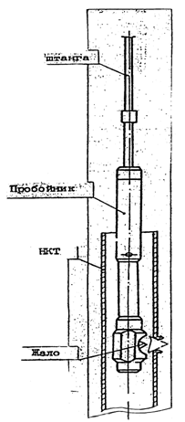 В трубу НКТ сбрасывается или опускается на штангах инструмент. После достижения необходимого интервала из корпуса инструмента выходит жало и после пробивки отверстия в НКТ автоматически утапливается в корпусе (рисунок 69).