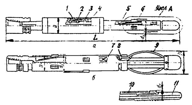 а — исполнение I; б — исполнение II; 1 — корпус; 2, 8 — фиксаторы; 3 — стержень; 4 — ниппель; 5 — плашкодержатель; 6 — плашка; 7 — нижний стержень; 9 — пластинчатые пружины; 10 — поводок; 11 — стержень с зубьями.
