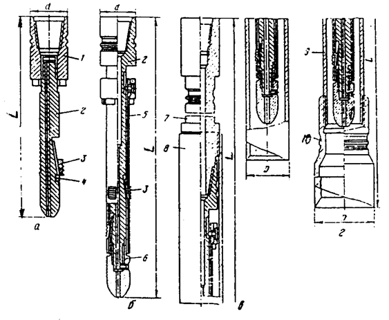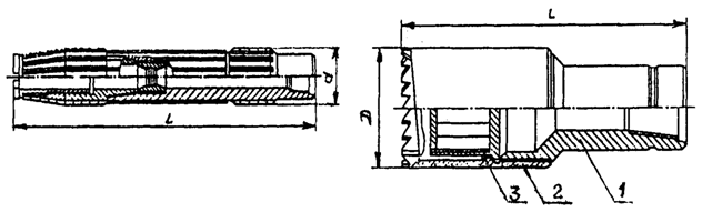 а — несквозной типа К; б — сквозной типа КС; 1 — присоединительная резьба к колонне; 2 — ловильная резьба; 3 — присоединительная резьба к воронке.