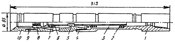 1 — переходник; 2 — стержень; 3 — плашка; 4 — клин; 5 — плашкодержатель; 6 — наконечник; 7 — специальный переводник; 8 — направление с вырезом; 9 — направление; 10 — воронка.