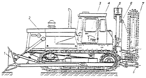 Агрегат имеет бульдозерный отвал 1, гидравлический кран 5, механизм для разработки грунта, состоящий из редуктора 8, режущего органа 7 с механизмом его подъема 6, прицепного устройства 9, предохранительного клапана 4 и механизма управления 3.
