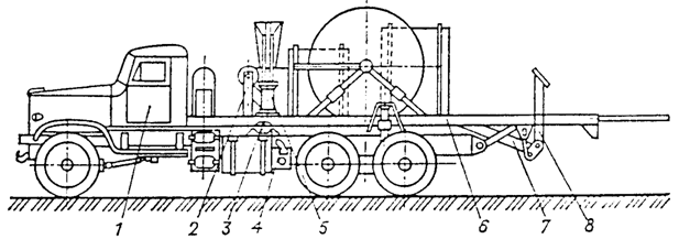 1 — шасси; 2 — стойка; 3 — лебедка; 4 — искрогаситель; 5 — гидравлический кран; 6 — рама агрегата; 7 — качающаяся рама; 8 — откидные трапы.