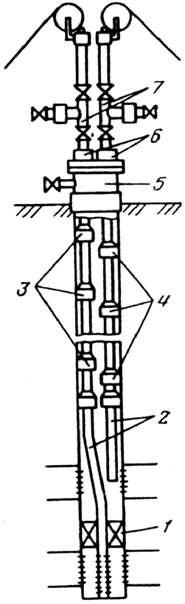Рисунок 39 — Схема установки для раздельной эксплуатации двух пластов с двумя параллельными рядами труб по схеме фонтан-фонтан 1 — пакер; 2 — насосно-компрессорные трубы; 3, 4 — малогабаритные пусковые клапаны с принудительным открытие соответственно для первого и второго рядов труб; 5 — тройник фонтанной арматуры (для сообщения с затрубным пространством); 6 — двухрядный сальник; 7 — тройники для направления продукции в