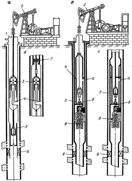 а — УТР невставного исполнения; б — УТР вставного исполнения; в — 1УНР вставного исполнения; г — 1УНР невставного исполнения; 1 — оборудование устья; 2 — станок-качалка; 3 — верхний насос; 4 — опора; 5 — нижний насос; 6 — пакер; 7 — автосцеп; 8 — автоматический переключатель пластов.