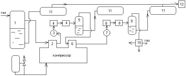 5 – сепаратор первой ступени, где происходит отделение жидкости, и газ идет на вторую ступень сжатия