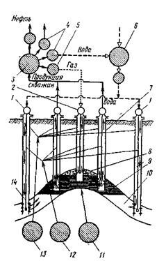 1 — скважины для нагнетания в пласт воды; 2 — скважина для нагнетании в пласт газа; 3 — система сбора пластовой жидкости и газа и их разделения на нефть, газ, воду; 4 — насосные станции; 5 — компрессорные станции; 6 — система поддержания пластового давления нагнетанием в пласт воды и газа; 7 — нефтяные скважины; 8 — газовая шапка; 9 — нефтенасыщенная часть пласта; 10 — водонасыщенная часть пласта; 11 — комплекс оборудования для воздействия на пласт с целью интенсификации добычи и увеличения нефтегазоотдачи путем увеличения проницаемости коллектора и снижения вязкости пластовой жидкости; 12 — комплекс оборудования для текущего ремонта скважин; 13 — комплекс оборудования для капитального ремонта скважин; 14 — оборудование для эксплуатации скважин.