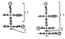 тройниковые - схемы 1,2,3 и 4; крестовые - схемы 5 и 6 (1 - переводник к трубной головке; 2 ‑ тройник; 3 - запорное устройство; 4 - манометр с запорно-разрядным устройством; 5 ‑дроссель; 6 - ответный фланец 7 - крестовина)
