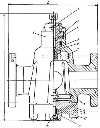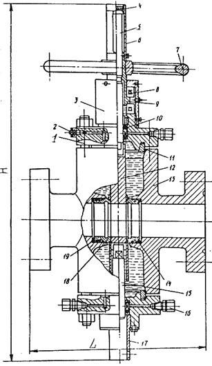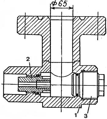 Пробковый кран со смазкой типа КППС - 65х14 (рис. 7) состоит из корпуса, конической пробки, крышки, через которую проходит регулировочный винт, позволяющий регулировать рабочий зазор между уплотни тельными поверхностями корпуса и пробки. Уплотнение регулировочного винта осуществляется манжетами, поджатие которых производится грундбуксой. Краны наполняются смазкой «Арматол-238» через 150¸180 циклов работы.