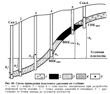 Поправку rgh вычитают при положении точки замера давления ниже условной плоскости и прибавляют при ее положении выше этой плоскости. На рис. 80 в законтурных водяных скв. 1 и 2 замеры давления произведены ниже условной плоскости, поэтому поправка должна вычитаться из замеренной величины. В водяной законтурной скв. 3 замер по техническим причинам выполнен выше условной плоскости, поэтому поправка прибавляется к значению замеренного давления. В этих трех скважинах поправку определяют с учетом плотности пластовой воды. По всем остальным скважинам замеры выполнены выше условной плоскости, поэтому поправку прибавляют к замеренным значениям, при этом учитывают плотность: по скв. 4, где пласт обводнен в процессе разработки, — воды, по скв. 5 — нефти.