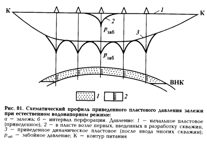 Давление в пласте у забоя скважины при ее работе называют забойным давлением Pзаб. По мере разбуривания залежи, дальнейшего ввода скважин в эксплуатацию и увеличения таким путем общего отбора жидкости из залежи воронки депрессии давления на забоях скважин сближаются, одновременно происходит постепенное снижение пластового давления в залежи в целом. Образуется общая для залежи воронка депрессии давления, осложненная локальными воронками скважин.