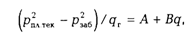 Коэффициент А численно равен значению (P2пл.тек – Р2заб)/ qг в точке пересечения индикаторной линии с осью ординат. Дробь в правой части уравнения соответствует 1/А, т.е.