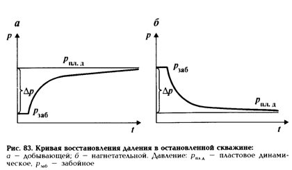 от забойного до динамического пластового. Характер КВД в добывающей и нагнетательной скважинах показан на рис. 83. По окончании исследования скважину вводят в эксплуатацию. При наличии достаточного опыта, когда становится известной необходимая в конкретных геологических условиях продолжительность остановки скважины для восстановления давления, замер динамического пластового давления можно проводить, спуская манометр в конце остановки, без снятия КВД.