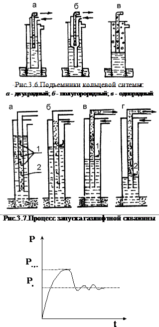 По мере нагнетания газа увеличивается разность уровней и возрастает давление заканчиваемого газа. На рис.3.8 приведена кривая изменения давления нагнетательного газа в зависимости от времени при пуске скважины.