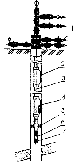 1 - фонтанная арматура; 2 - скважинная камера; 3 - колонна насосно-компрессорных труб; 4 - газлифтный клапан; 5 - пакер; 6 - приемный клапан; 7 - ниппель приемного клапана
