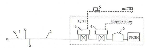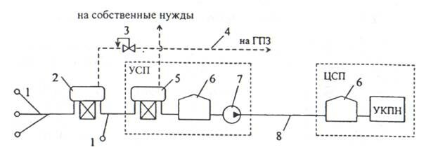 1 – скважины, 2 – сепаратор І cтупени, 3 – регулятор давления, 4 – газопровод, 5 - сепаратор ІІ cтупени, 6 – резервуары, 7 – насос, 8 – нефтепровод, УСП – участковый газосборный пункт, ЦСП – центральный газосборный пункт, УКПН – установка комплексной подготовки нефти