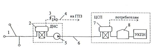 1 – скважины, 2 – сепаратор І cтупени, 3 – регулятор давления, 4 – газопровод, 5 –насосы, 6 – нефтепровод, 7 - сепаратор ІІ cтупени, 8 – резервуар, ДНС – дожиманая насосная станция