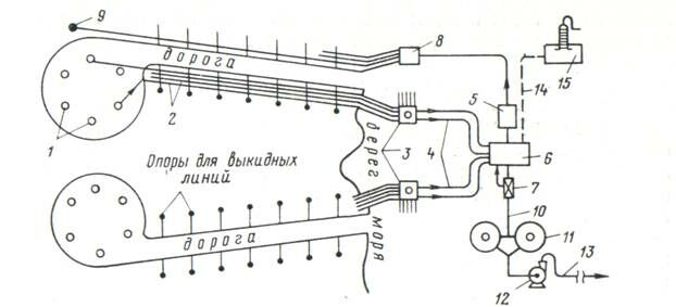Сбор нефти газа и воды на морских месторождениях, удаленных от берега, проводится следующим образом (см. рис. 6). Нефтегазовая смесь из скважин 1 под собственным давлением подается в короткие выкидные линии 2, из которых направляется в автоматизированное устройство, понижающее устьевое давление 3. Из устройства нефть и вода по сборным коллекторам 4, проложенным по дну моря, поступают на нефтесборный пункт в сырьевые резервуары 5. Из сырьевых резервуаров нефть и вода могут транспортироваться на сушу или при помощи нефтеналивных судов, или с помощью нагнетания сырьевым насосом 6 по сборному нефтепроводу 10 на установку подготовки нефти 11. На установке подготовки нефти нефть отделяется от воды и газа, воду направляют на установку подготовки воды 13, а газ – на собственные нужды. С установки подготовки воды 13 вода поступает на кустовую насосную станцию 14, откуда центробежными насосами высокого давления подается в нагнетательные скважины 19. Товарная нефть, обезвоженная и обессоленная на установке подготовки 11, через автоматизированную установку замера товарной нефти 12 по нефтепроводу 15 подается в товарные резервуары 16. Из резервуаров нефть забирается насосами головной насосной станции 17 и по нефтепроводу 18, проложенному по морскому дну, подается на нефтеперерабатывающий завод на суше.