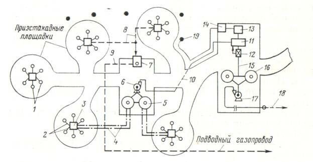 1 – эксплуатационные скважины, 2 – короткие выкидные линии, 3- автоматизированное устройство понижения устьевого давления, 4 – сборные коллекторы, 5 – сырьевые резервуары, 6 – сырьевой насос, 7 – ДКС, 8 – газопроводы, 9 – подводный газопровод, 10 – сборный нефтепровод, 11 – установка подготовки нефти, 12 – автоматизированная установка замера товарной нефти, 13 – установка подготовки воды, 14 – кустовая насосная станция, 15 – нефтепровод товарной нефти, 16 – резервуары товарной нефти, 17 – насосы головной насосной станции, 18 – сборный нефтепровод, 19 – нагнетательные скважины