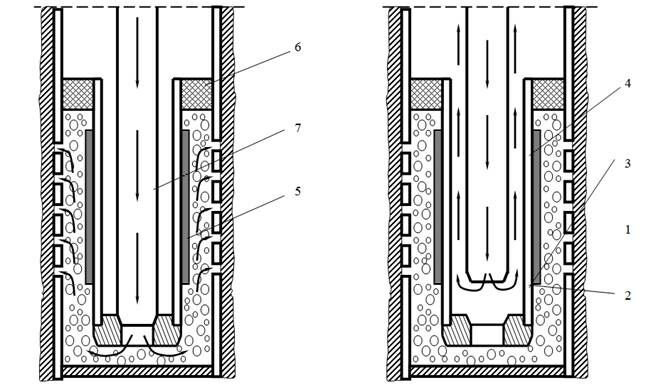 1 - эксплуатационная колонна, 2 – спецпереводник с левой резьбой, 3 – корпус фильтра-оства, 4 – перфорированная часть остова, 5 – проволочная обивка, 6 – фильтр-заглушка, 7 – НКТ