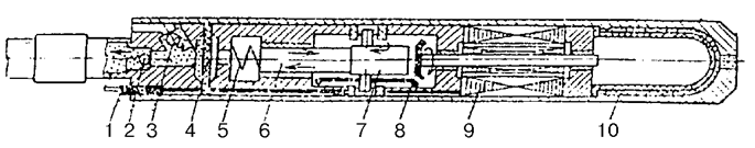 1 — токоввод; 2 — нагнетательный клапан; 3 — всасывающий клапан; 4 — диафрагма; 5 — пружина; 6 — плунжерный насос; 7 — эксцентриковый привод; 8 — конический редуктор; 9 — электродвигатель; 10 — компенсатор