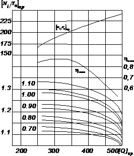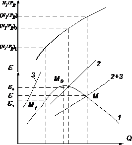Поскольку магистраль и «станционное кольцо» соединены между собой параллельно, то суммирование характеристик 2 и 3 необходимо проводить по подаче Q при постоянных значениях степени сжатия e. Выполненное таким образом сложение даёт суммарную характеристику системы (2+3), на которую работает нагнетатель в новых условиях.