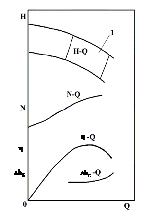 Характеристикой насоса называется графическая зависимость основных параметров насосов (напора Н, мощности N, К.П.Д. h, допустимого кавитационного запаса Dhд или высоты всасывания НS от подачи Q).