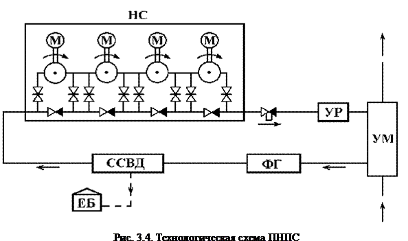 Технологическая схема ПНПС показана на рис. 3.4. Нефть от узла подключения НПС к магистрали (УМ) движется на вход насосной станции (НС) через площадку фильтров-грязеуловителей (ФГ) и систему сглаживания волн давления (ССВД), затем после НС вновь поступает в магистраль через узел регуляторов давления (УР) и узел подключения (УМ).