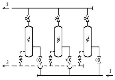 Точность показания счетчика «Турбоквант» h достаточно высока лишь для определенного диапазона производительности Q (рис. 3.4). Поэтому для обеспечения измерениям высокой точности при любых производительностях трубопровода узлы учета оборудуются несколькими параллельно установленными счетчиками (рис. 3.5) и количество рабочих счетчиков варьируется в зависимости от производительности.