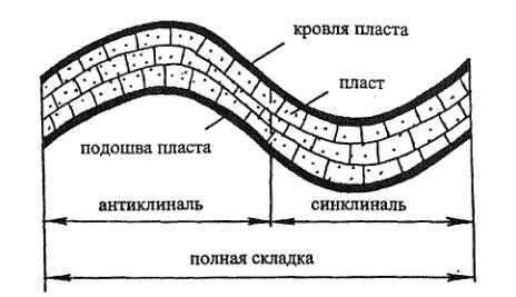 Различают складки в виде синклинали, антиклинали и моноклинали Синклиналь — это складка, обращенная выпуклостью вниз к центру Земли, в ядре которой более «молодые» породы, чем по краям. Антиклиналь - это складка, обращенная выпуклостью к поверхности Земли, в ядре которой находятся более древние породы. Последовательно расположенные антиклиналь и синклиналь образуют полную складку.