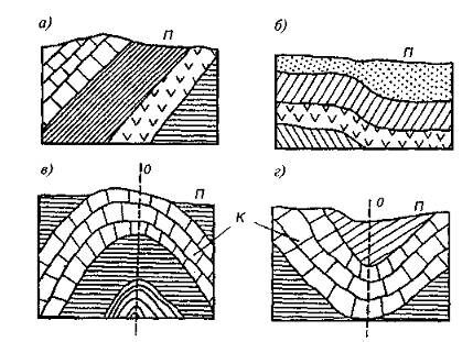 моноклиналь; б—флексура; а —антиклиналь, г — синклиналь; К— крылья; О—ось складок; поверхность земли