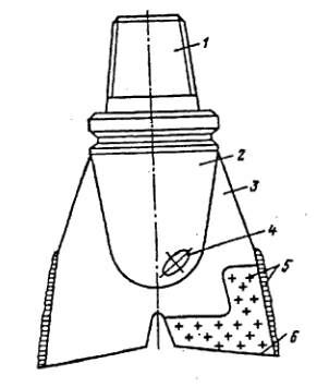 Рис.2.1. Лопастное долото: 1 - головка с присоединительной резьбой;2 - корпус; 3- лопасть;4-промывочное отверстие;5-твердосплавное покрытие;6 - режущая кромка;