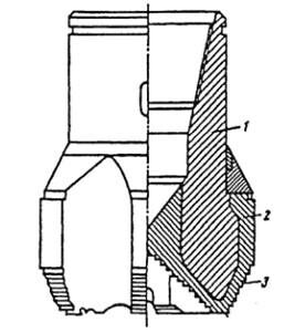 Рис.6.19.Алмазное долото: I - корпус; 2 матрица; 3 - алмазные зерна;