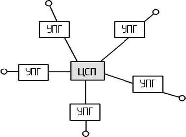 В начальный период разработки месторождения (рисунок 2.5), а также на промыслах с большими расстояниями между скважинами на площади газоносности, применяют индивидуальную схему сбора газа, при которой каждая скважина имеет свою установку подготовки газа УПГ или газосборный пункт – ГСП, после которой газ подается в газосборный коллектор и на централизованный газосборный пункт (ЦСП). Эту же схему можно применить на завершающем этапе разработки месторождения в условиях низкого рабочего давления путем приближения малогабаритной дожимной компрессорной станции как можно ближе к устью скважины.