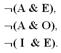 Если речь идёт о простых категорических суждениях: А, Е, I, O, то закон противоречия может быть выражен следующим образом: