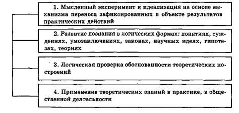 Теоретический уровень является высшим уровнем научного познания. На этом уровне особо важное значение имеют идеализация и мысленный эксперимент. Мысленный эксперимент является аналогом вещественного. В ходе мысленного эксперимента объект исследования преобразуется и выступает как идеализированный предмет, как результат абстракции. Идеализация всегда является и продуктом и результатом деятельности, результатом мысленного конструирования и исходным пунктом теоретического мышления.